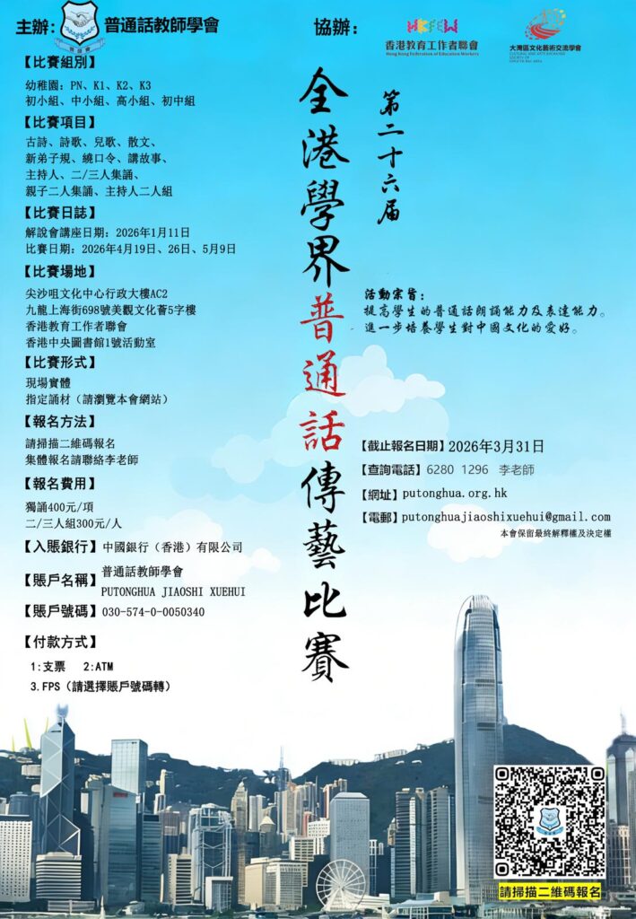 | 活動宗旨 | – 提高學生的普通話朗誦能力及表達能力。 – 進一步培養學生對中國文化的愛好。 |